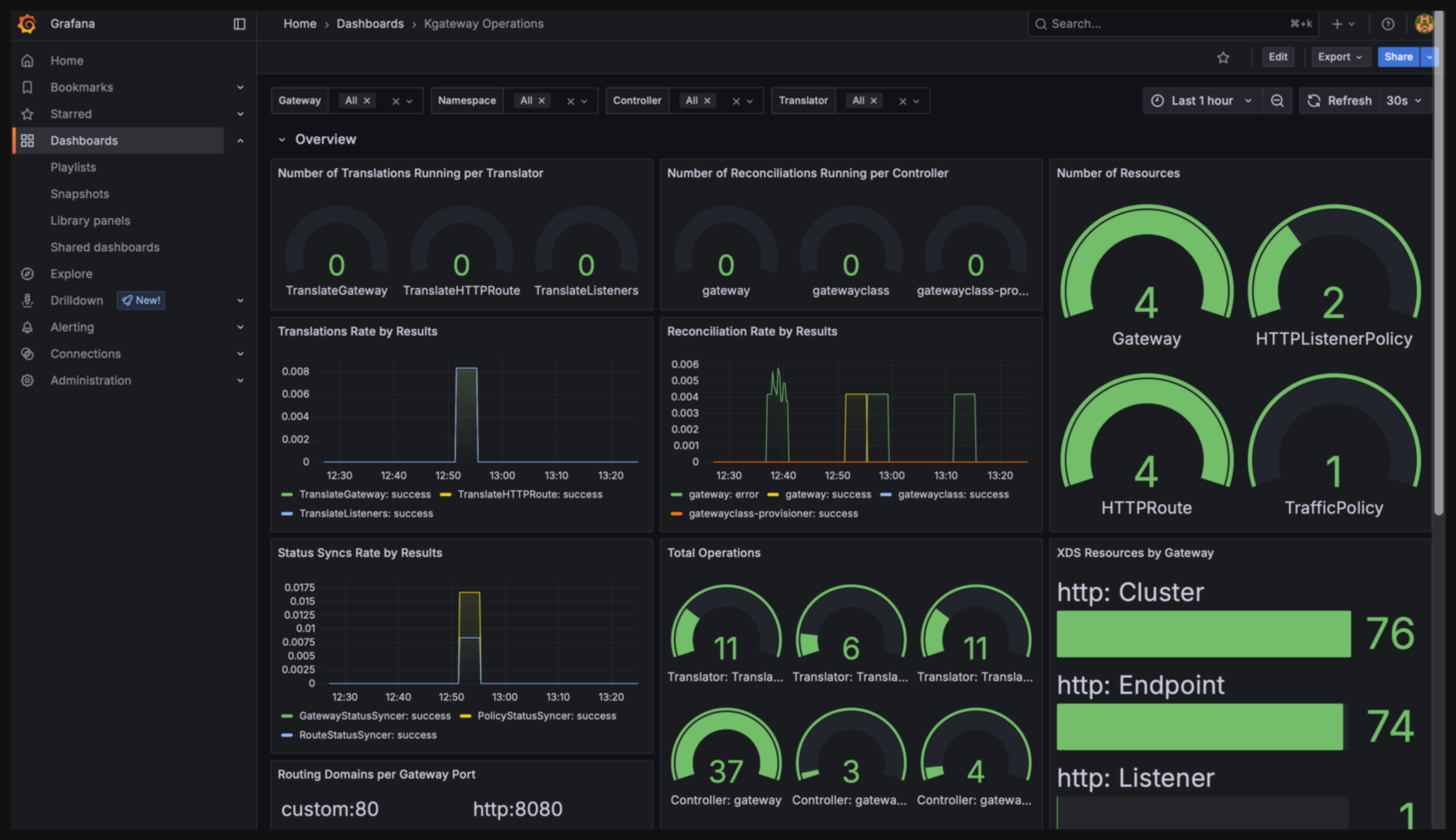 Metric Description Number of translations running per translator The number of active Kubernetes Gateway API translations. Number of reconciliations running per controller The number of active reconciliations for each controller. Number of resources The number of Kubernetes Gateway API and kgateway resources in your cluster. Translations rate by results The rate of translations in seconds and their statuses. Reconciliation rate by results The rate of reconciliations in seconds and their statuses. Status syncs rate by results The rate of status syncs in seconds and their statuses. Total operations The total number of reconciliations for each controller plus the total number of translations for each translator, and the total number of status syncs for each status syncer. XDS resources by gateway The total number of resources in the XDS snapshot for each gateway, such as clusters, endpoints, listeners, and routes. Routing domains per gateway port The total number of routing domains for each gateway and port. Reconciliation latency In the last 5 minutes, the amount of time that it took 70%, 90%, and 99% of reconciliation processes to finish. Status Syncer Latency In the last 5 minutes, the amount of time that it took 70%, 90%, and 99% of status syncs to finish. Translation Latency In the last 5 minutes, the amount of time that it took 70%, 90%, and 99% of translations to finish. XDS Snapshot Sync Latency In the last 5 minutes, the amount of time that it took 70%, 90%, and 99% of xDS snapshots to finish. Resource Status Sync Latency In the last 5 minutes, the amount of time that it took 70%, 90%, and 99% of resource status syncs to finish. Status Syncs by Resource The total number of status syncs completed by resource type.